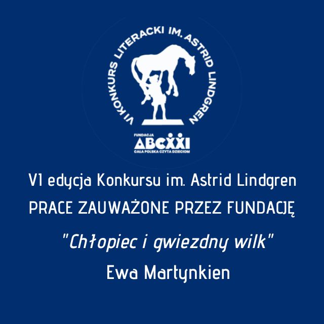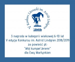 Jest to V edycja konkursu organizowanego przez Fundację Cała Polska Czyta Dzieciom. Wyróżnienie otrzymała moja najnowsza powieść pt. „Mój kumpel Jeremi”. Zostanie wydana i w pierwszym kwartale przyszłego roku ukaże się w księgarniach. O konkursie możecie więcej przeczytać na stronie Fundacji Cala Polska Czyta Dzieciom: http://www.calapolskaczytadzieciom.pl/v_konkurs_alindgren_laureaci