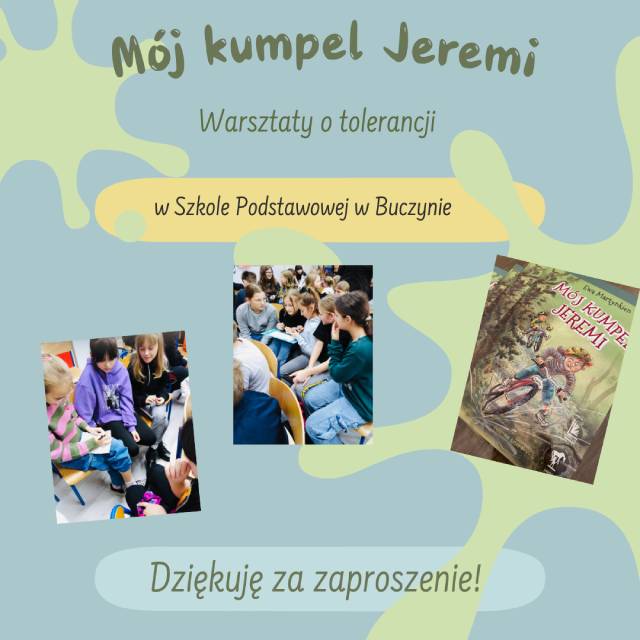 „Mój kumpel Jeremi” od Wydawnictwo Literatura. Poruszyliśmy tematy różnorodności, akceptacji, tolerancji i granic. Ale też nie zabrakło zwyczajnych, bardzo ważnych tematów jak nasze pasje, zainteresowania, przyjaźnie.